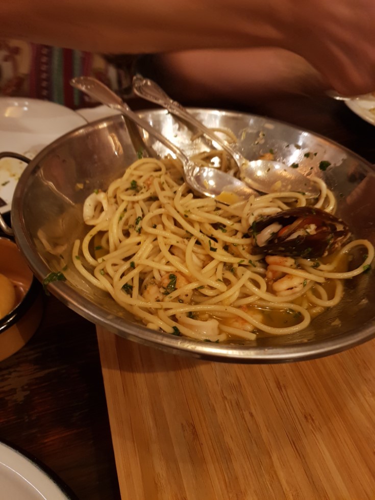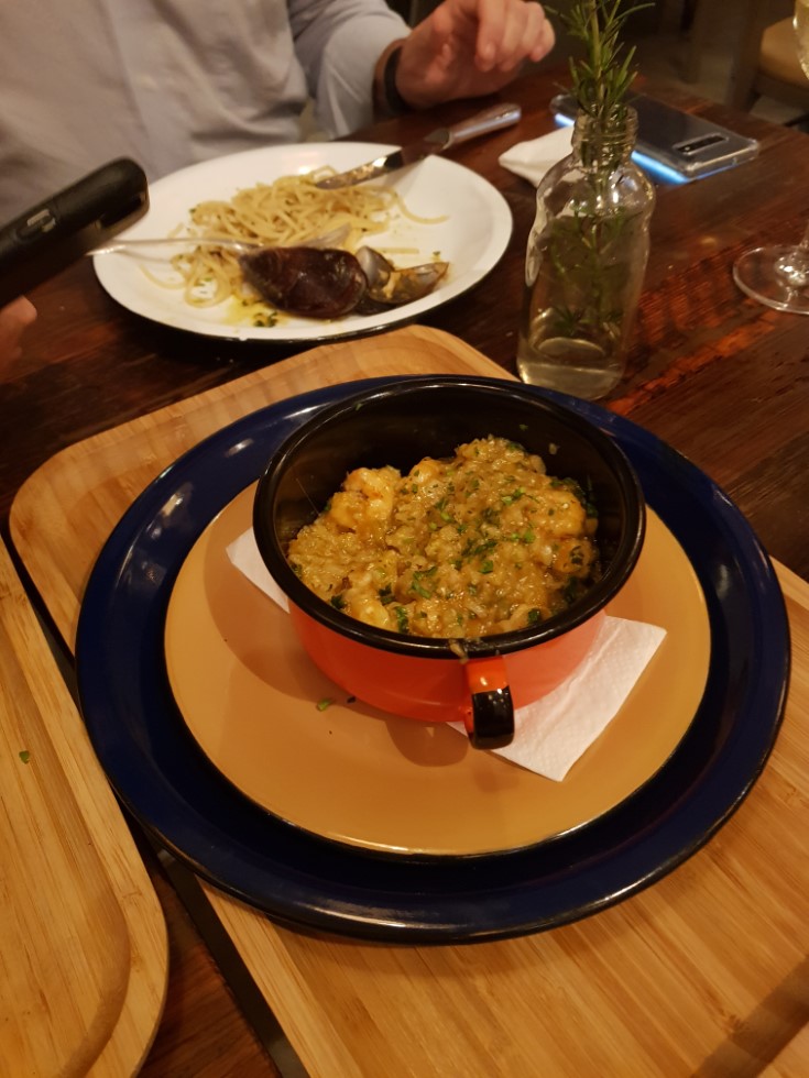 Polvo foi a opção da Sra: S, tipo carpaccio com um molho branco com uma acidez delicada e polvo no ponto certo. O Sr H foi de spaghetti com frutos do mar do dia. Massa no ponto certo e molho com vinho branco e com leve toque de coentro e mariscos. Saboroso. Eu fui de risotinho de camarão com limão siciliano. O arroz ficou overcooked, não gostei não, mas o Sr; H provou e comentou que os sabores estavam todos ali. O arroz que passou do ponto.