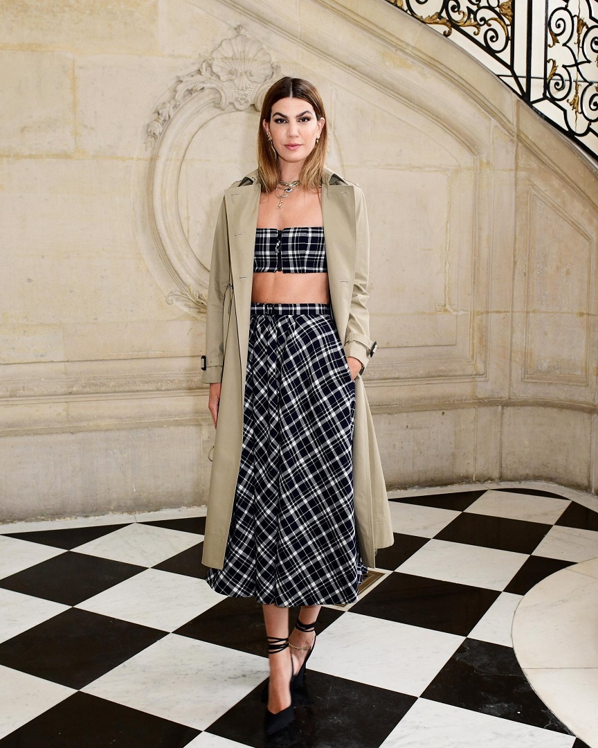 Bianca Brandolini usa sobretudo bege Dior Outono 2021, top e saia de algodão xadrez preto e branco. Ela também usa sapatos de bailarina.