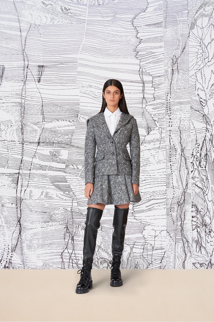 Anya Chalotra veste jaqueta Dior Outono-Inverno 2021-2020 de lã cinza e saia com camisa de algodão branca Dior. Ela também usa botas de couro preto Dior.