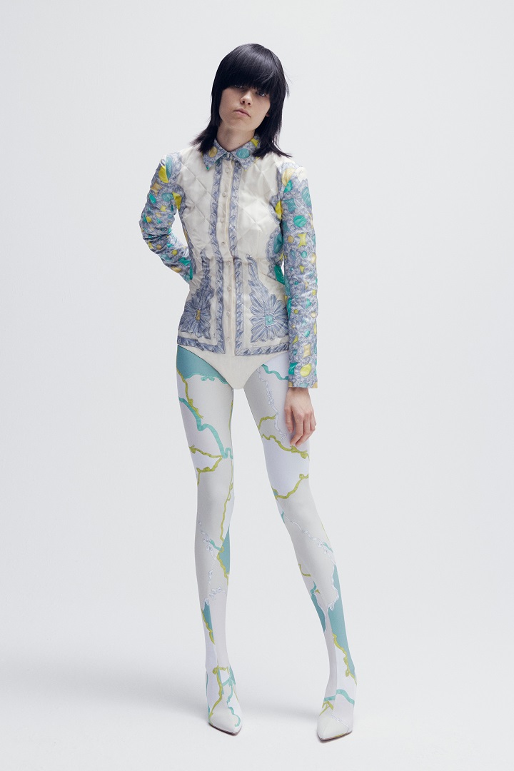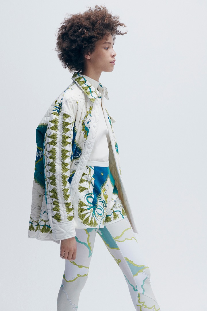 O clima invernal pede peças acolchoadas e com cara de edredom e a Emilio Pucci traduziu esse conforto em jaquetas bomber e em shorts em seda ou veludo técnico, com preenchimentos sustentáveis feitos de fibras de seda natural e de garrafas R-PET. O tecido dos macacões de esqui também é feito de náilon reciclado, em alinhamento com o compromisso da Pucci em dar ênfase a questão da sustentabilidade em suas coleções.