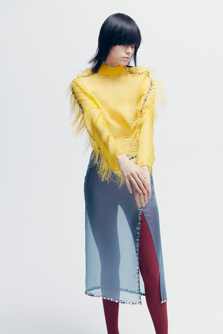 A modernidade impregna a ideia de um guarda-roupa modular, de peças separadas, que podem ser combinadas de maneiras infinitas de acordo com as vontades individuais. Jaquetas bomber acolchoadas, blusões e shorts curtos, polos e bodysuits em jacquard de mohair, túnicas e casacos dupla face, macacões, vestidos plissados leves e vestidos de chiffon com transparências, decorados com cristais e penas são os destaques de uma coleção que carrega todo o DNA da Emilio Pucci, infundido com tons de marfim, amarelo, rosa, laranja, nude e petróleo. Os mesmos tons caracterizam as estampas Cervinia, Cortina d’Ampezzo, Specchi, Clessidra, Nuages e Nappine: prints e desenhos icônicos, direto dos arquivos da Pucci foram atualizados e dessaturados.