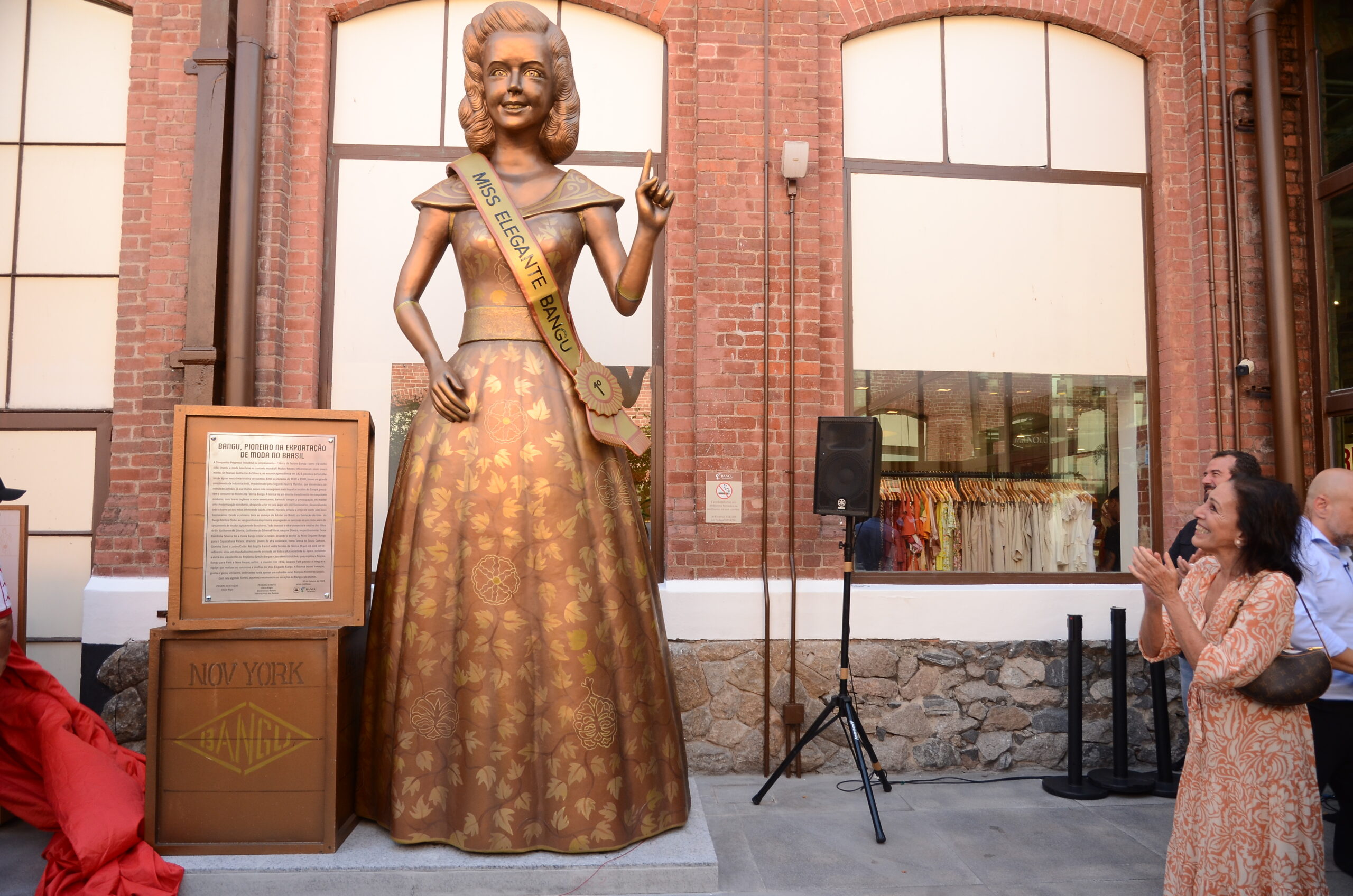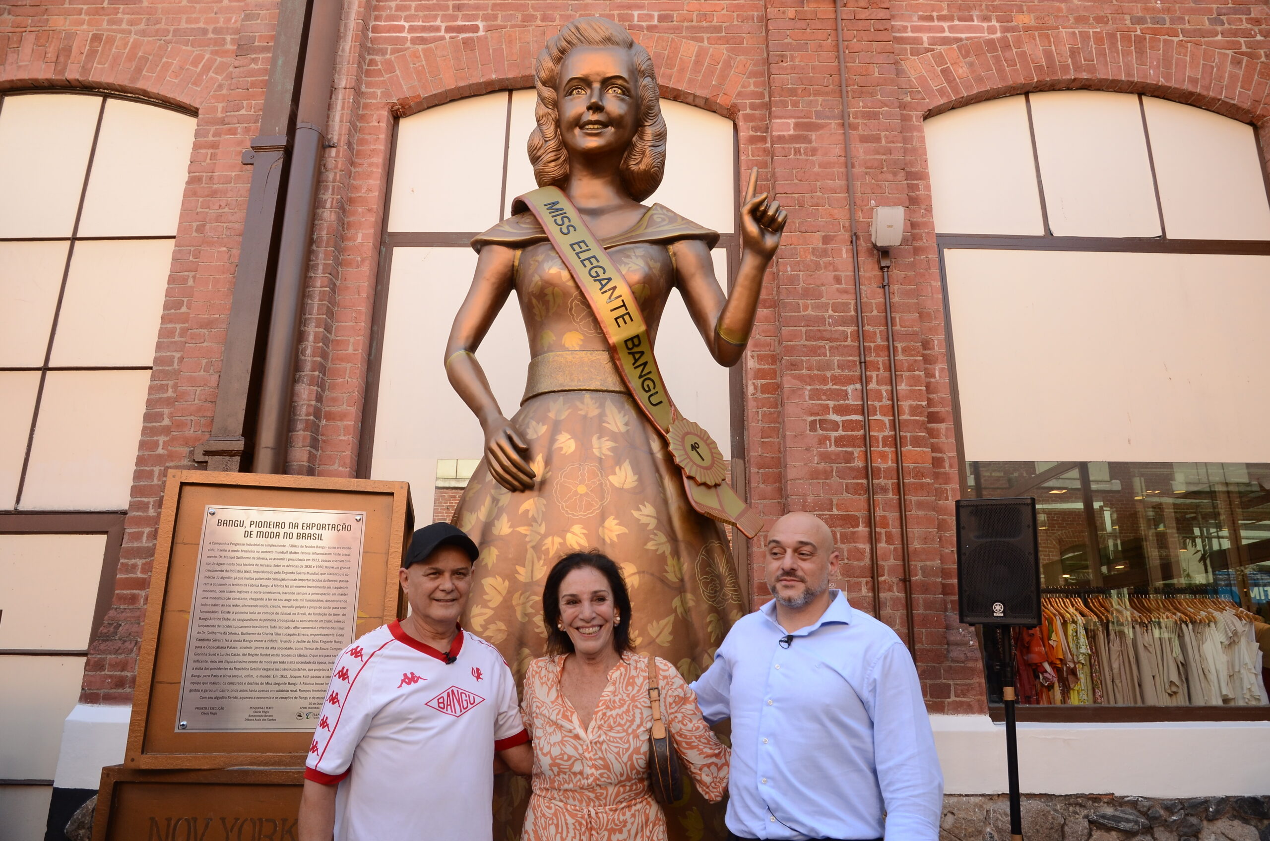 Às 14h, em frente à icônica chaminé da antiga Fábrica Bangu, foi inaugurada a estátua “Miss Elegante Bangu”, uma obra de arte com 3,70 metros de altura, criada pelo artista plástico e cenógrafo Clécio Régis. A estátua, feita em fibra e resina com acabamento que simula bronze, presta tributo ao pioneirismo da fábrica com a exportação de tecidos no Brasil, relembrando o célebre concurso Miss Elegante Bangu, que marcou a sociedade brasileira na década de 50 e foi o precursor do Miss Brasil. A escultura é inspirada na miss Corina Baldo, vencedora da primeira edição.