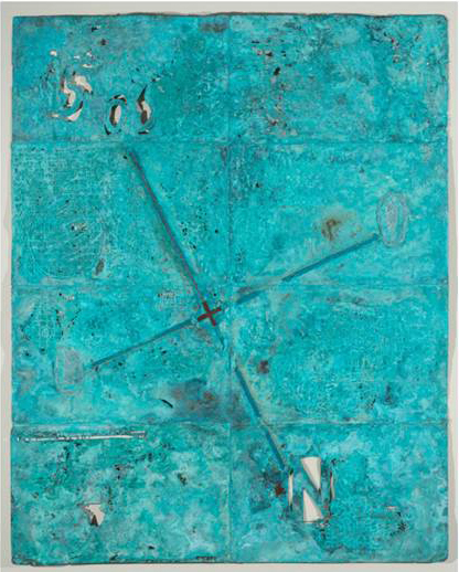 Entre elas, uma porta de 2,10 metros de altura, uma instalação com 40 monotipias sobre objetos pessoais e utensílios cotidianos, como roupas, pratos, copos e talheres, e ainda um grupo de obras em que o papel registrou azulejos partidos, quebrados. Também de 2024 são as duas obras “Sem título”, da série “Atlânticos” (2024), em cobre, corrosão e oxidação, com 130cm de altura.
