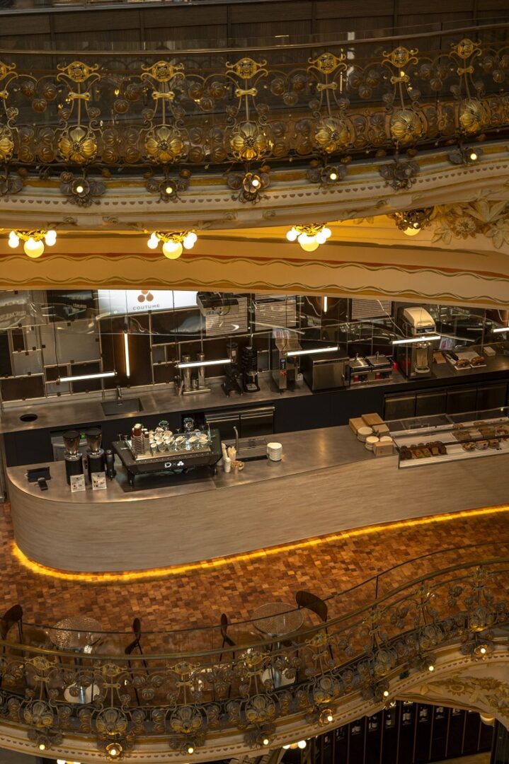 Juntos, o empresário Tom Clark, fundador da casa de café, e Daubinet, figura emblemática da cena internacional da confeitaria, pensaram este lugar como um verdadeiro laboratório dedicado à degustação de cafés e de doces exclusivos dentro da loja de departamentos, proporcionando ao clientes uma visão privilegiada da famosa cúpula em estilo art nouveau deste icônico endereço parisiense.