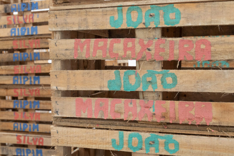 No terceiro andar, a instalação que dá nome à mostra já entrega o tom: caixas de feira empilhadas viram quase totens — desses que a gente reconhece de longe, mas nunca tinha olhado assim.