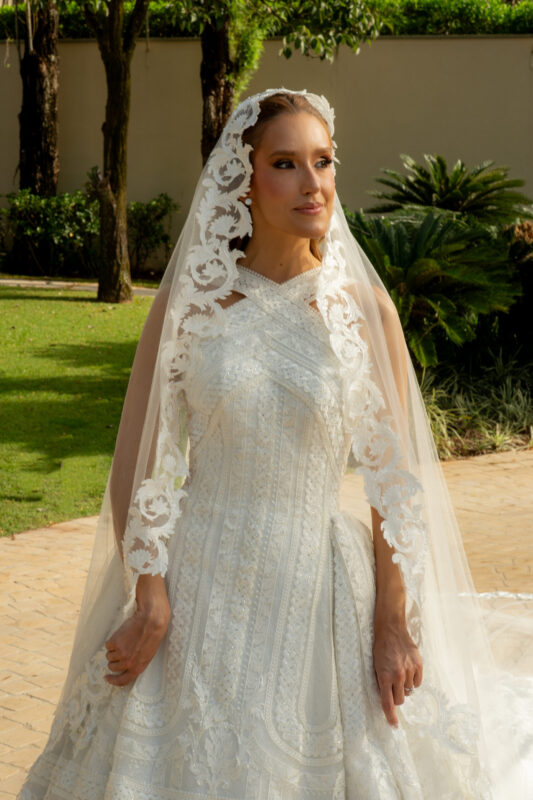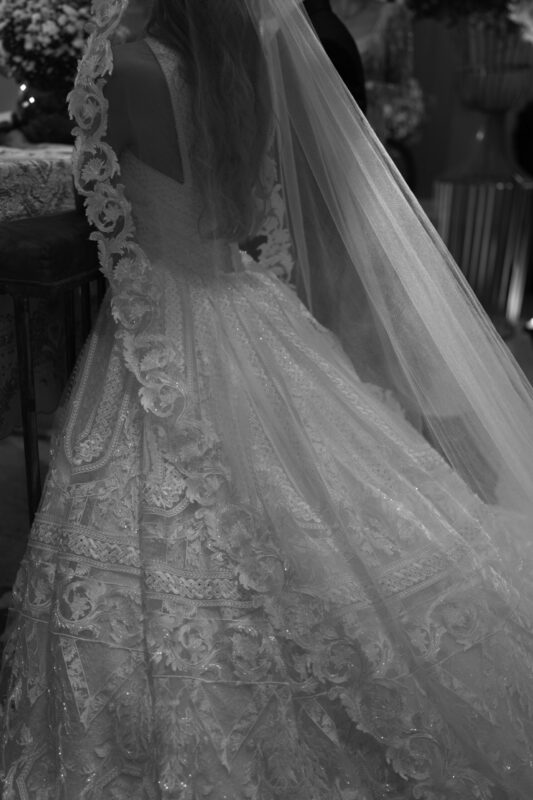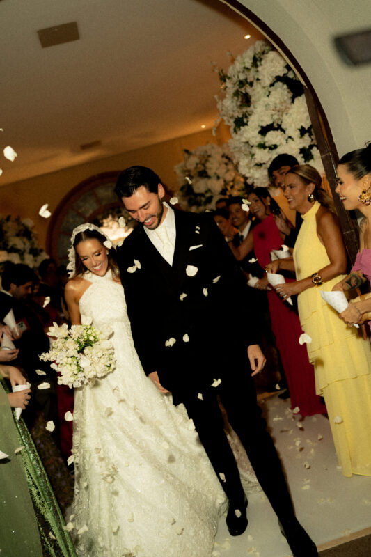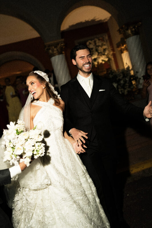 O bolo de Denilson Lima seguia a mesma linha ornamental — alto, preciso, quase escultórico. A noiva vestiu Junior Santaella, em renda de Zuhair Murad, bordada à mão. O noivo, Camargo. Entre os convidados, nomes como Anderson Baumgartner, João Kepler e Diego Candelero.