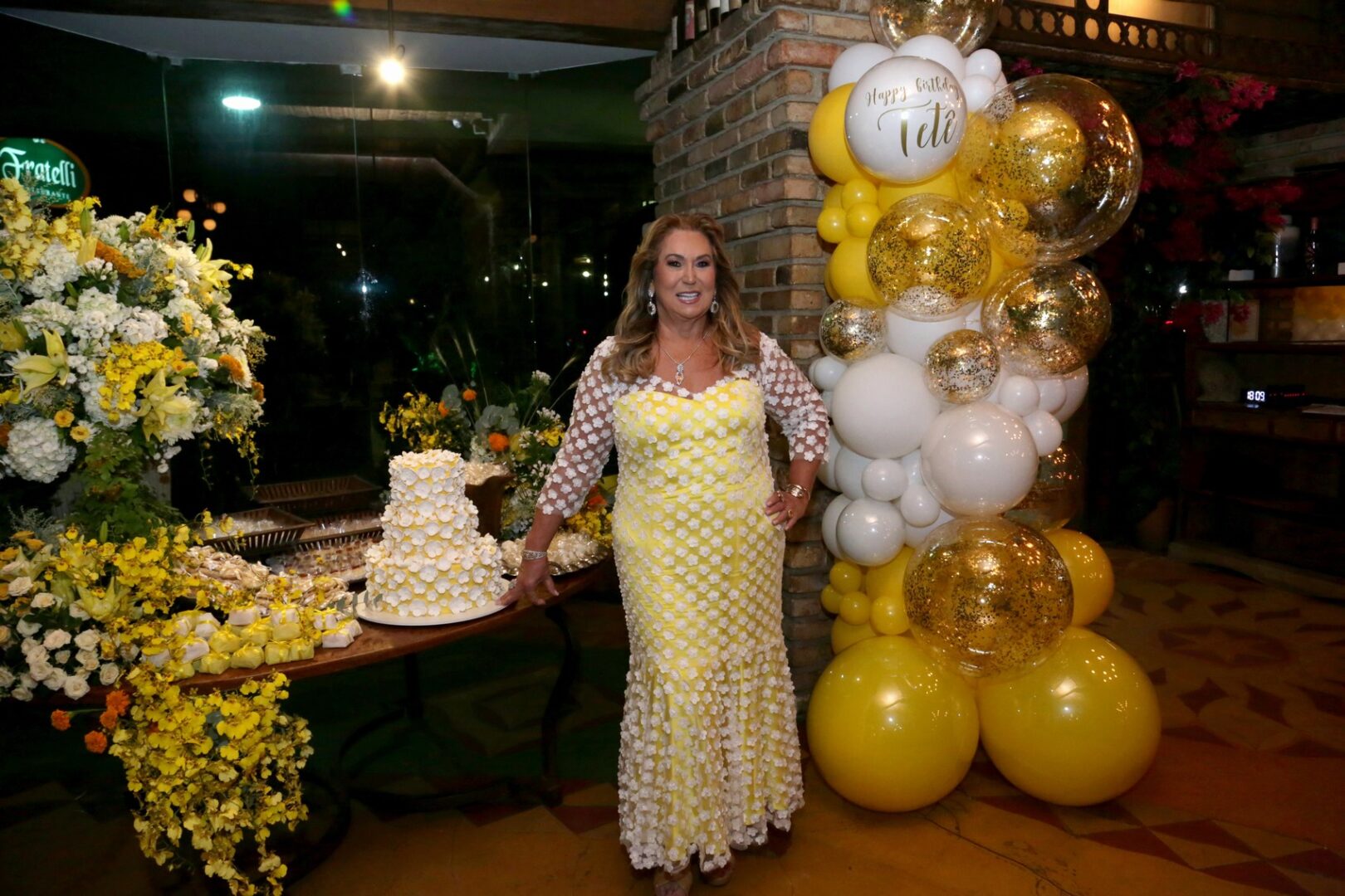 Theresa Macedo a aniversariante do dia 07 de maio maio 8, 2025 - Theresa Macedo brilhou de amarelo e branco e celebrou seu BDay no Fratelli da Barra para mais de 200 convidadas com muita animação e alegria. Não faltou cílios postiços. O look assinado por Stella Fischer, que replicava as flores no impecável bolo de Lurdes Vidal, o makeup Marcelo Hicho estava Divine. A decoração de Carlos… Continue lendo